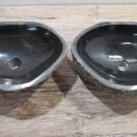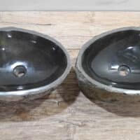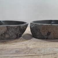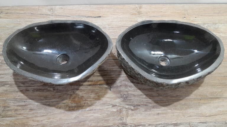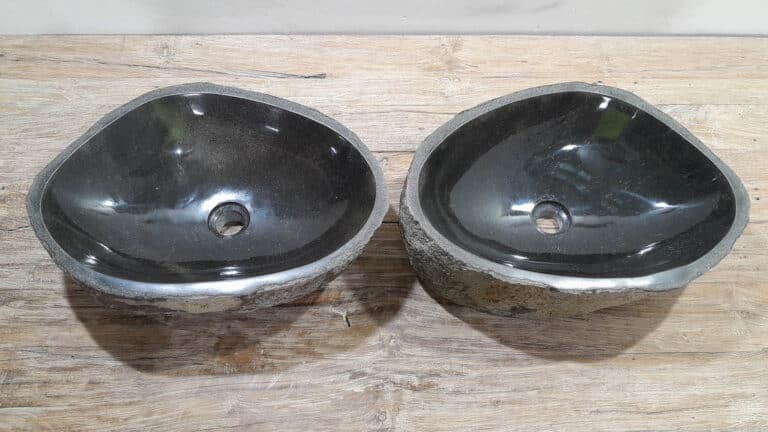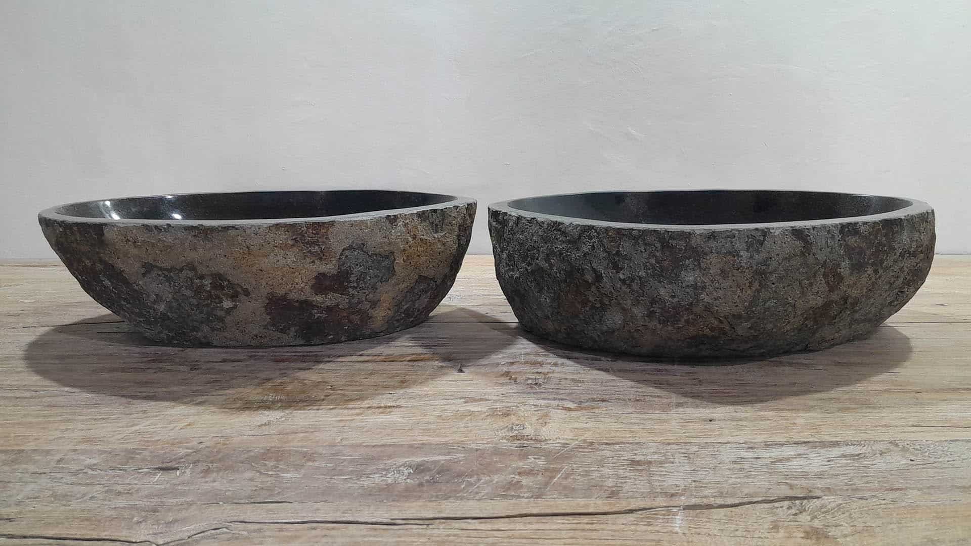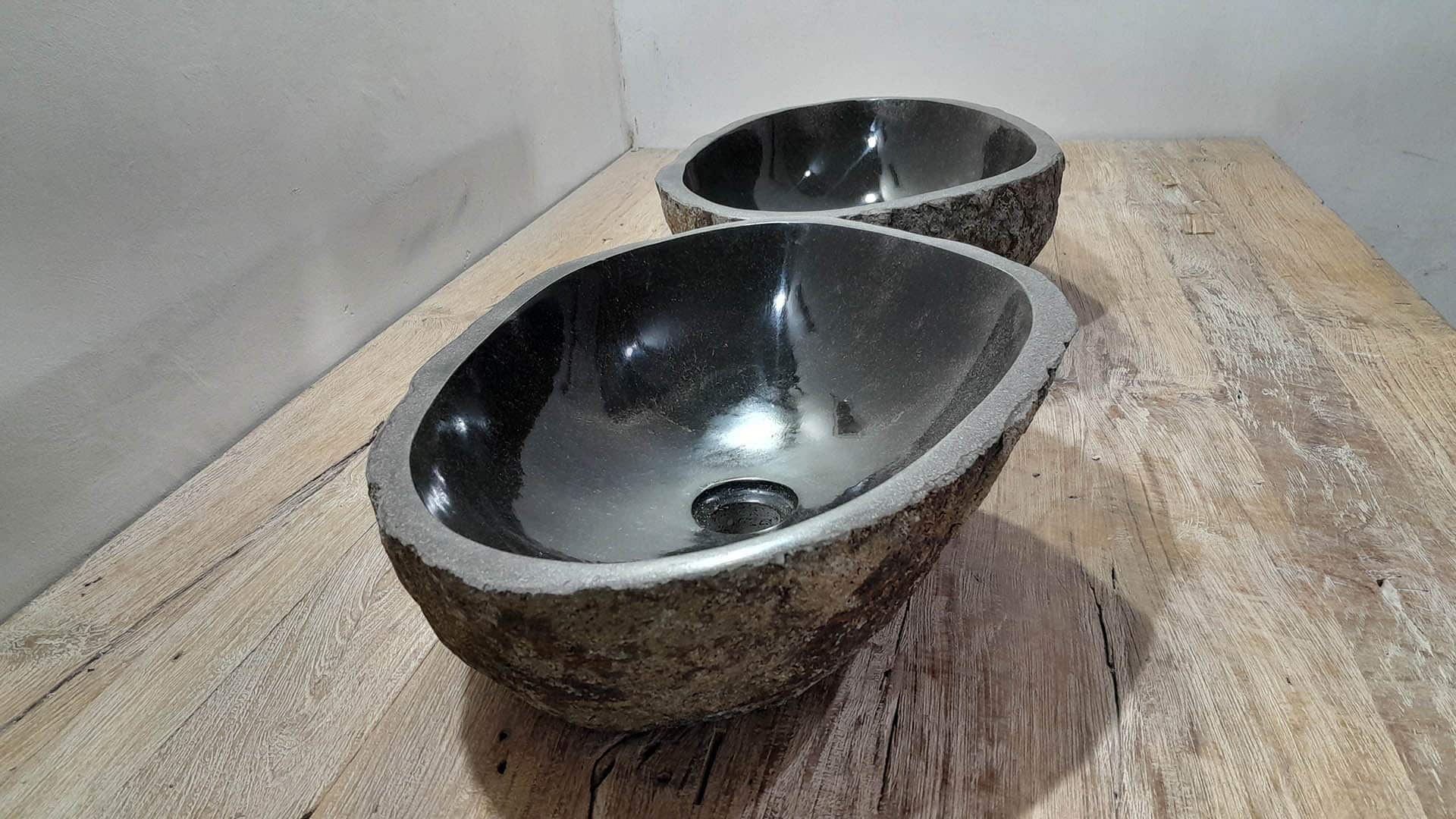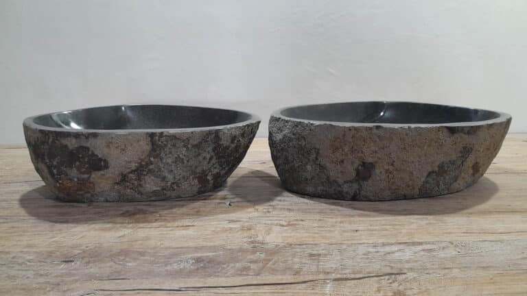 Mit diesem Flussstein Waschbecken Set holen Sie sich ein besonderes Naturprodukt in Ihr Zuhause. Das Set besteht aus zwei handgefertigten Becken, gefertigt aus einem einzigen Flussstein. So stimmen Farbe, Größe und Maserung perfekt überein, während beide Becken ihre eigene natürliche Variation behalten. Ideal für Ihren Doppelwaschtisch. Jedes Set wird vollständig von Hand aus massivem Naturstein hergestellt. Die Innenseite ist glatt poliert für optimale Wasserableitung und einfache Reinigung, während die Außenseite roh bleibt und den robusten, natürlichen Charakter bewahrt.