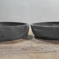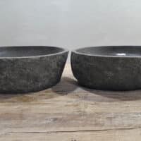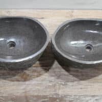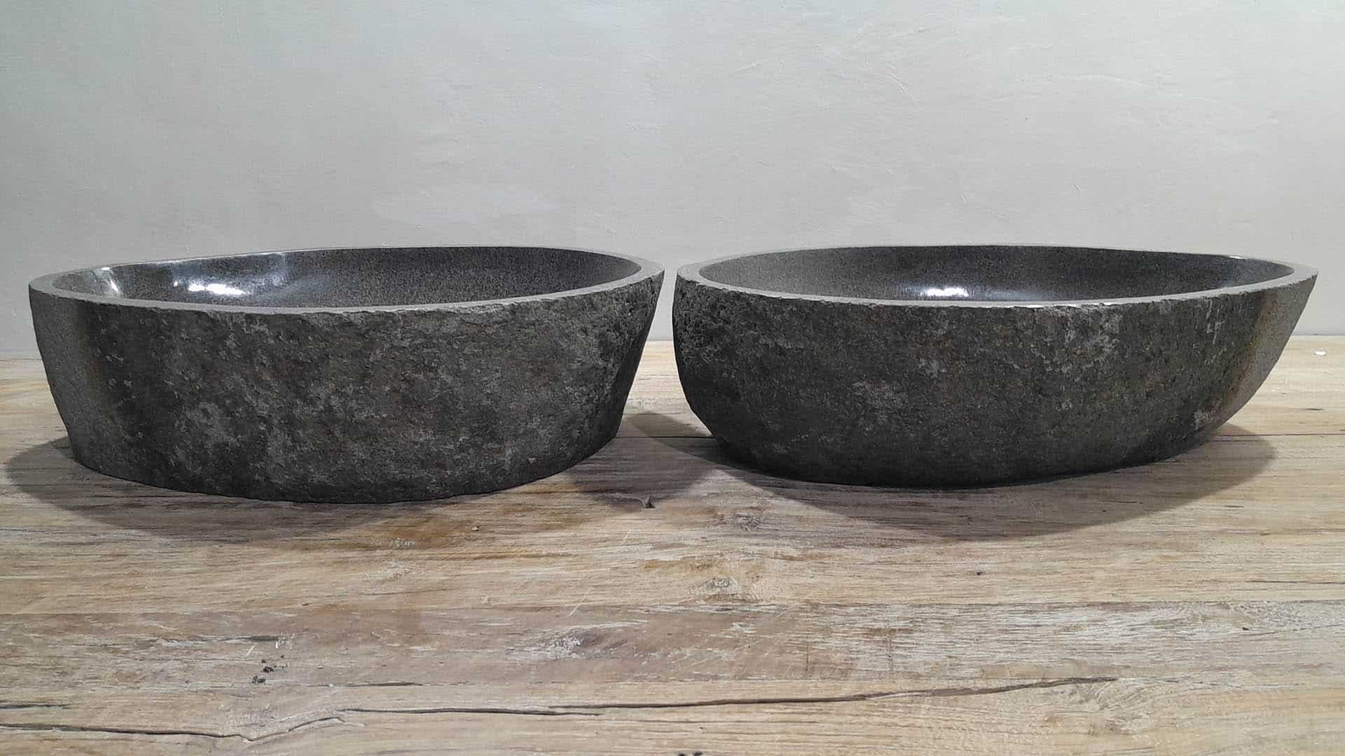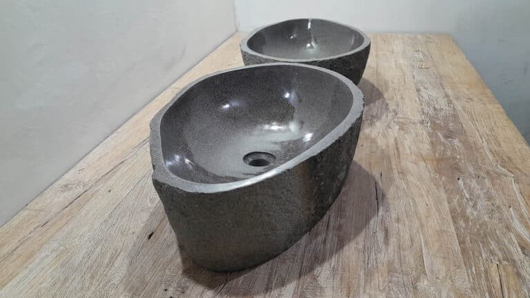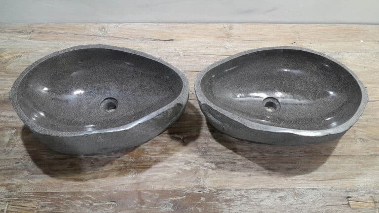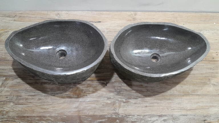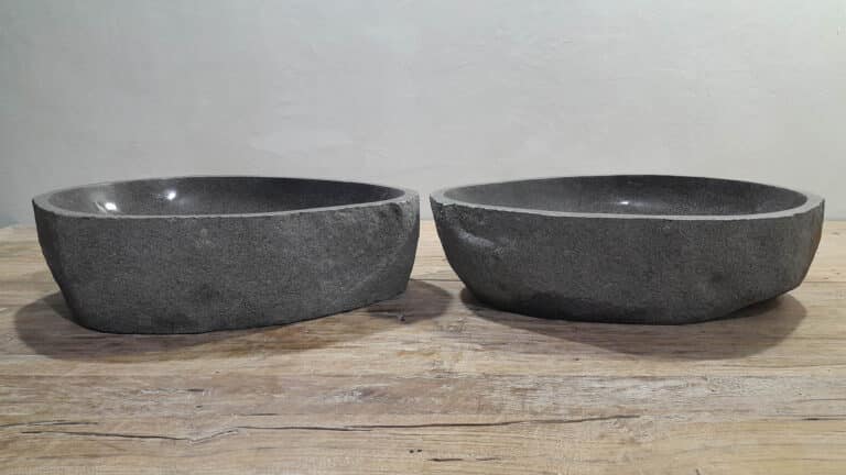 Mit diesem Flussstein Waschbecken Set holen Sie sich ein besonderes Naturprodukt in Ihr Zuhause. Das Set besteht aus zwei handgefertigten Becken, gefertigt aus einem einzigen Flussstein. So stimmen Farbe, Größe und Maserung perfekt überein, während beide Becken ihre eigene natürliche Variation behalten. Ideal für Ihren Doppelwaschtisch. Jedes Set wird vollständig von Hand aus massivem Naturstein hergestellt. Die Innenseite ist glatt poliert für optimale Wasserableitung und einfache Reinigung, während die Außenseite roh bleibt und den robusten, natürlichen Charakter bewahrt.