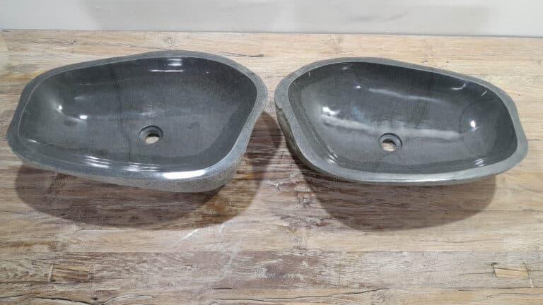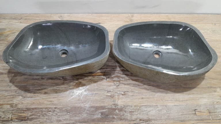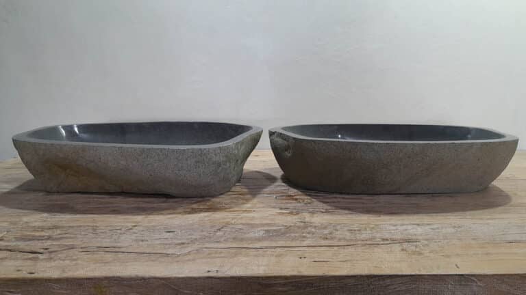 Mit diesem Flussstein Waschbecken Set holen Sie sich ein besonderes Naturprodukt in Ihr Zuhause. Das Set besteht aus zwei handgefertigten Becken, gefertigt aus einem einzigen Flussstein. So stimmen Farbe, Größe und Maserung perfekt überein, während beide Becken ihre eigene natürliche Variation behalten. Ideal für Ihren Doppelwaschtisch. Jedes Set wird vollständig von Hand aus massivem Naturstein hergestellt. Die Innenseite ist glatt poliert für optimale Wasserableitung und einfache Reinigung, während die Außenseite roh bleibt und den robusten, natürlichen Charakter bewahrt.