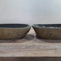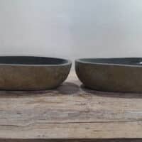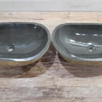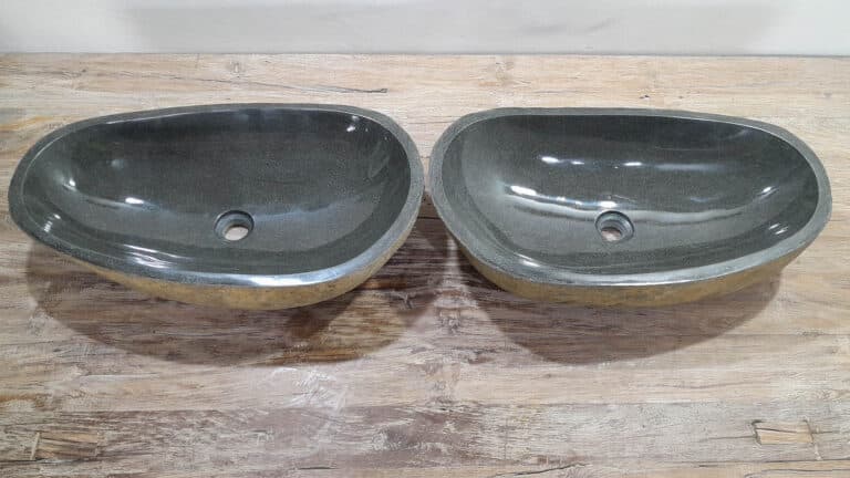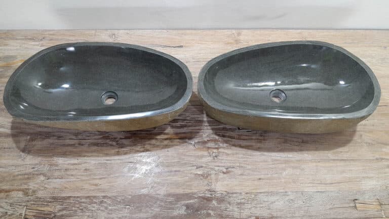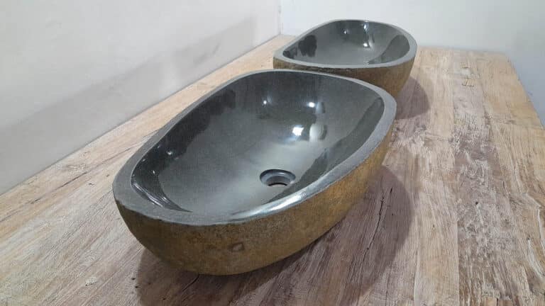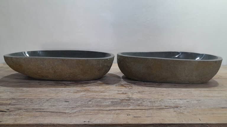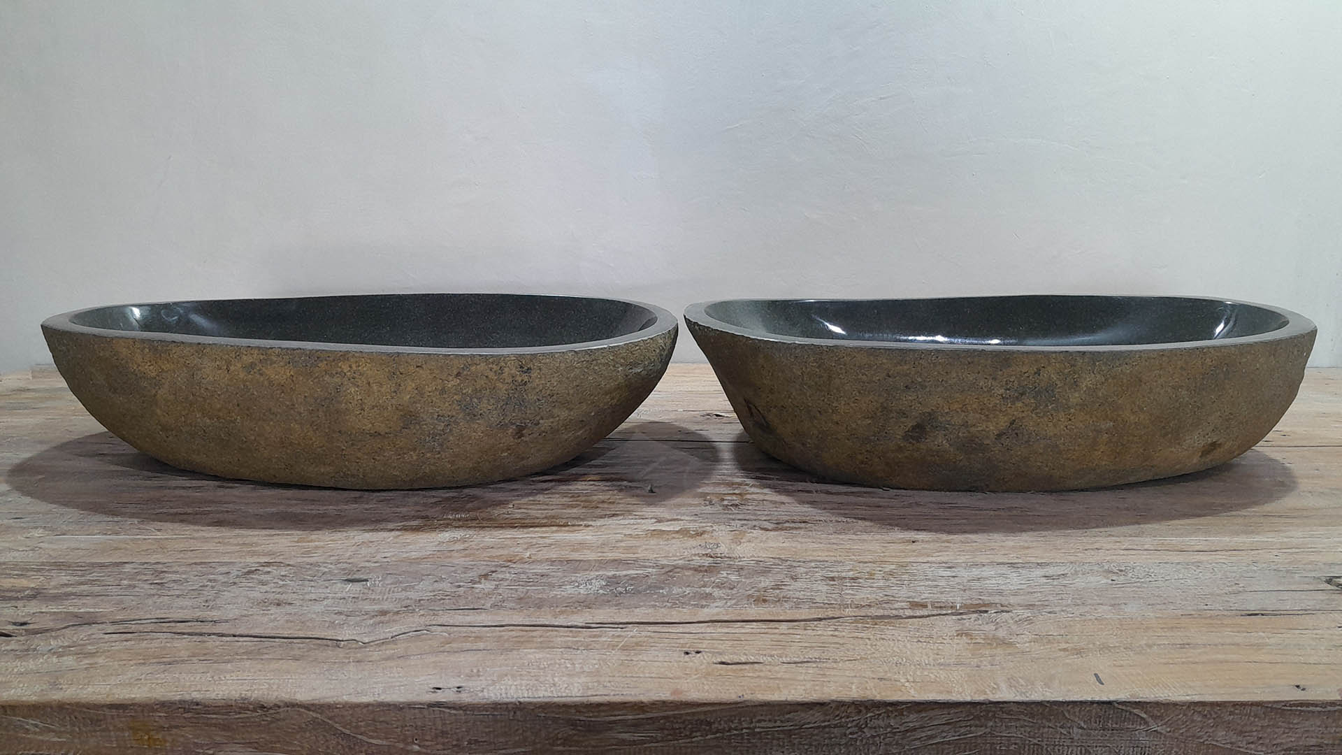 Mit diesem Flussstein Waschbecken Set holen Sie sich ein besonderes Naturprodukt in Ihr Zuhause. Das Set besteht aus zwei handgefertigten Becken, gefertigt aus einem einzigen Flussstein. So stimmen Farbe, Größe und Maserung perfekt überein, während beide Becken ihre eigene natürliche Variation behalten. Ideal für Ihren Doppelwaschtisch. Jedes Set wird vollständig von Hand aus massivem Naturstein hergestellt. Die Innenseite ist glatt poliert für optimale Wasserableitung und einfache Reinigung, während die Außenseite roh bleibt und den robusten, natürlichen Charakter bewahrt.