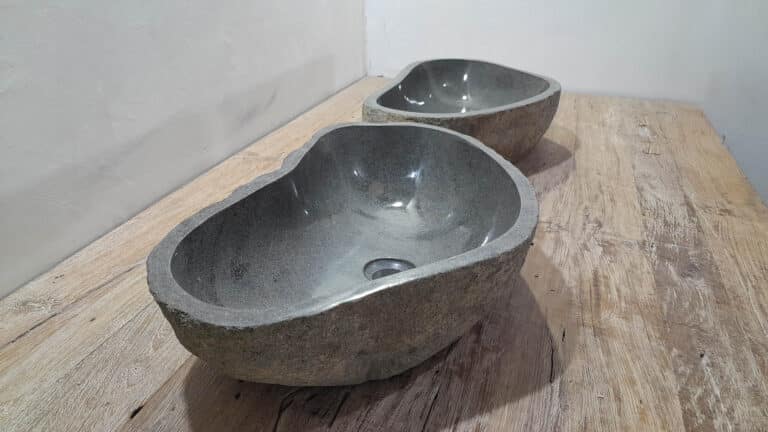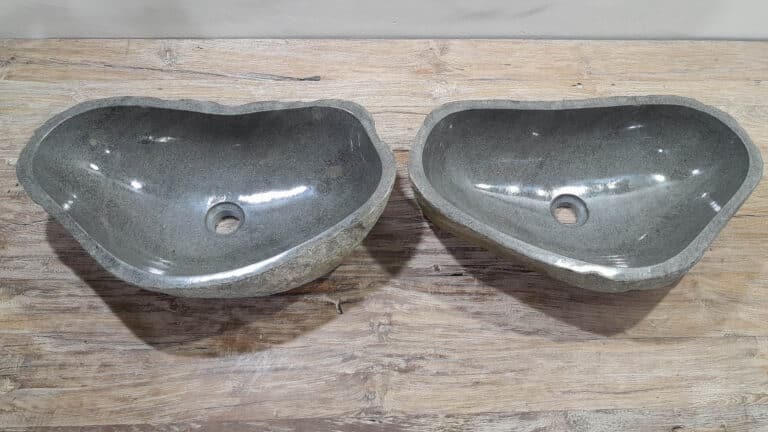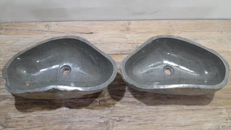 Mit diesem Flussstein Waschbecken Set holen Sie sich ein besonderes Naturprodukt in Ihr Zuhause. Das Set besteht aus zwei handgefertigten Becken, gefertigt aus einem einzigen Flussstein. So stimmen Farbe, Größe und Maserung perfekt überein, während beide Becken ihre eigene natürliche Variation behalten. Ideal für Ihren Doppelwaschtisch. Jedes Set wird vollständig von Hand aus massivem Naturstein hergestellt. Die Innenseite ist glatt poliert für optimale Wasserableitung und einfache Reinigung, während die Außenseite roh bleibt und den robusten, natürlichen Charakter bewahrt.