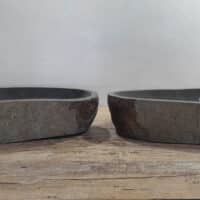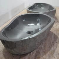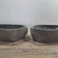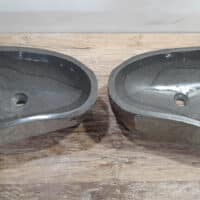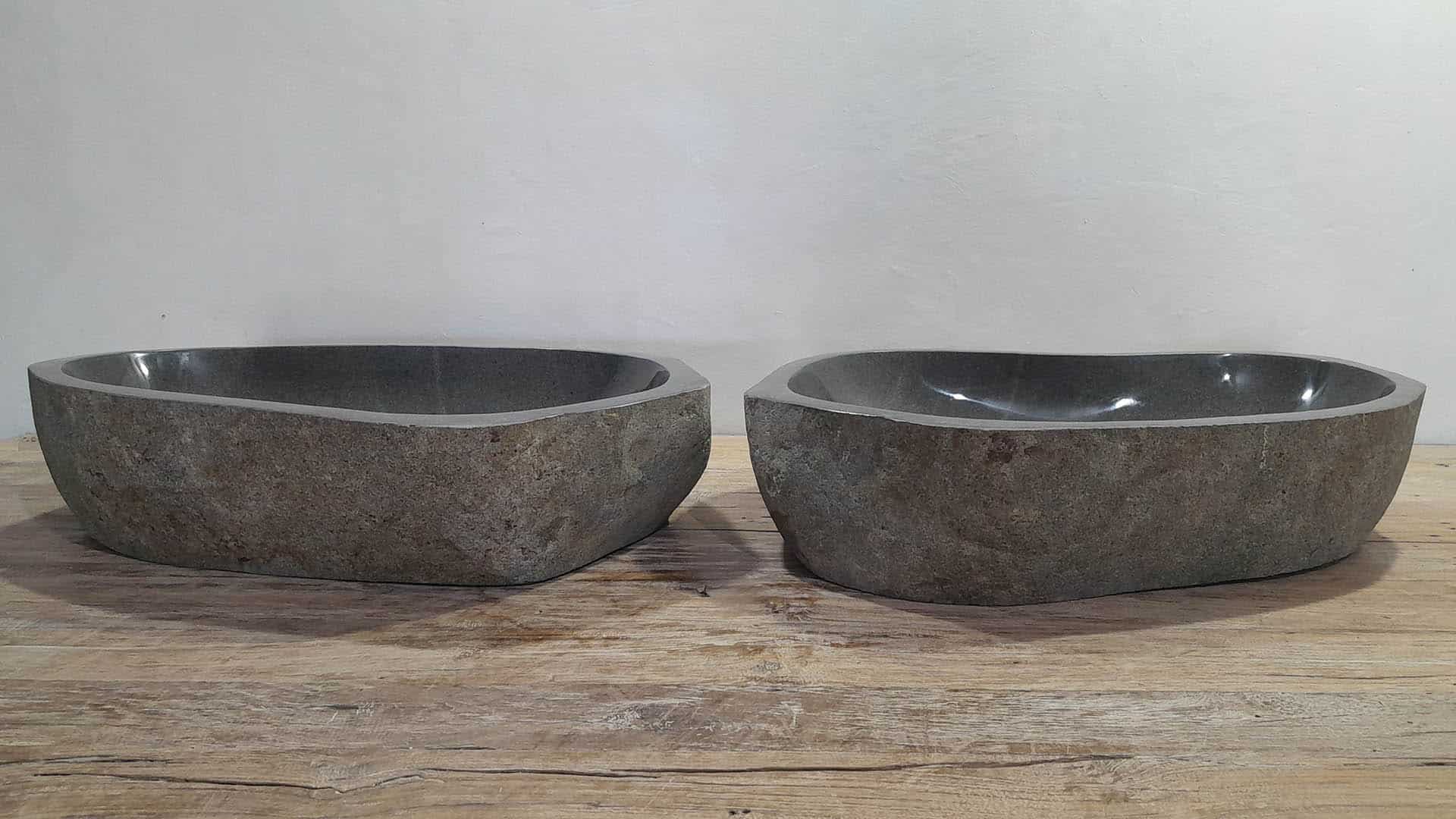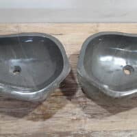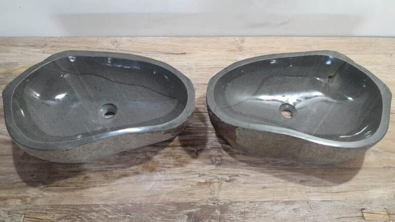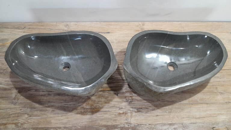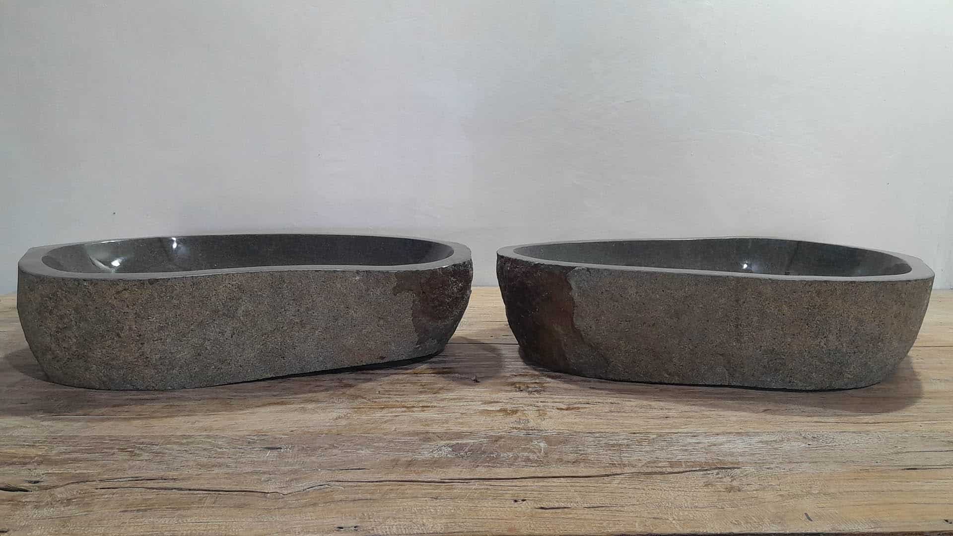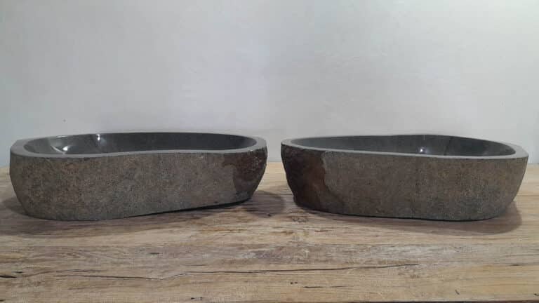 Mit diesem Flussstein Waschbecken Set holen Sie sich ein besonderes Naturprodukt in Ihr Zuhause. Das Set besteht aus zwei handgefertigten Becken, gefertigt aus einem einzigen Flussstein. So stimmen Farbe, Größe und Maserung perfekt überein, während beide Becken ihre eigene natürliche Variation behalten. Ideal für Ihren Doppelwaschtisch. Jedes Set wird vollständig von Hand aus massivem Naturstein hergestellt. Die Innenseite ist glatt poliert für optimale Wasserableitung und einfache Reinigung, während die Außenseite roh bleibt und den robusten, natürlichen Charakter bewahrt.