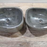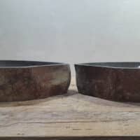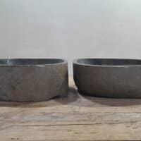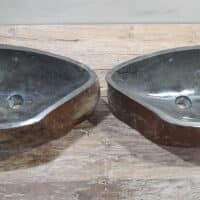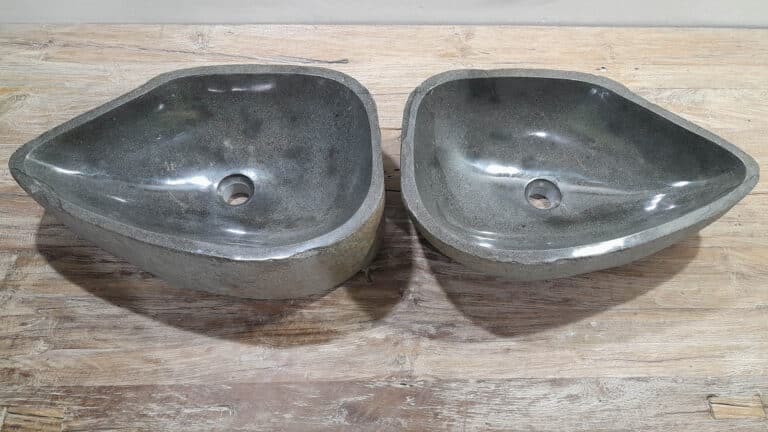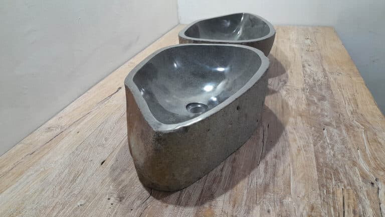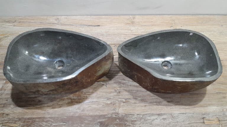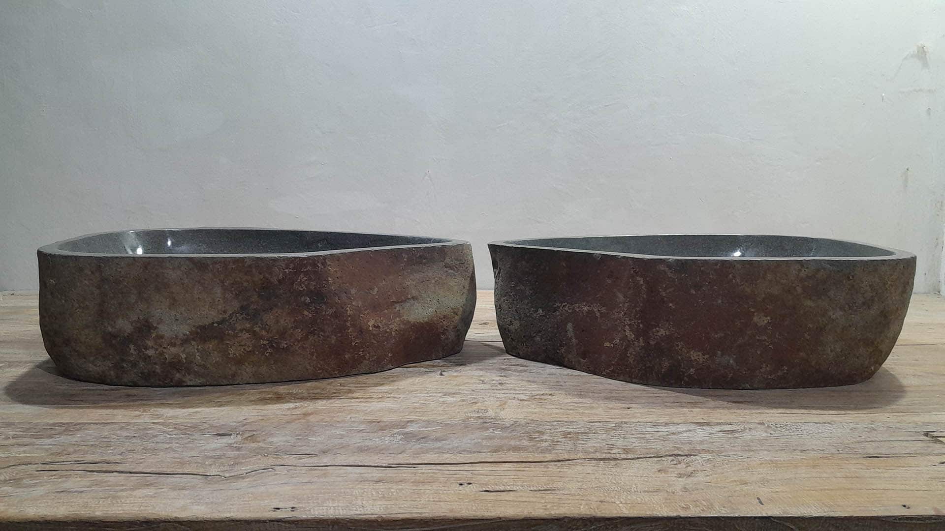 Mit diesem Flussstein Waschbecken Set holen Sie sich ein besonderes Naturprodukt in Ihr Zuhause. Das Set besteht aus zwei handgefertigten Becken, gefertigt aus einem einzigen Flussstein. So stimmen Farbe, Größe und Maserung perfekt überein, während beide Becken ihre eigene natürliche Variation behalten. Ideal für Ihren Doppelwaschtisch. Jedes Set wird vollständig von Hand aus massivem Naturstein hergestellt. Die Innenseite ist glatt poliert für optimale Wasserableitung und einfache Reinigung, während die Außenseite roh bleibt und den robusten, natürlichen Charakter bewahrt.