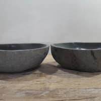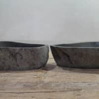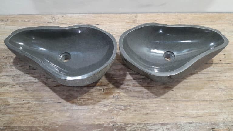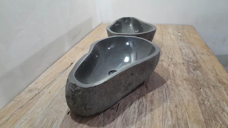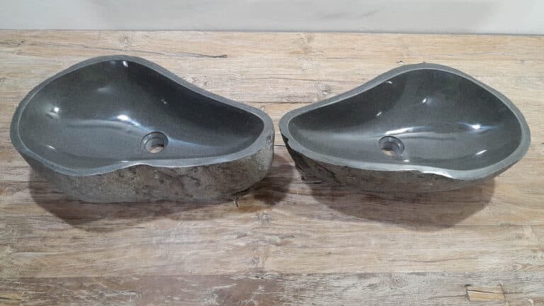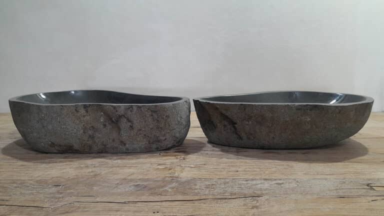 Mit diesem Flussstein Waschbecken Set holen Sie sich ein besonderes Naturprodukt in Ihr Zuhause. Das Set besteht aus zwei handgefertigten Becken, gefertigt aus einem einzigen Flussstein. So stimmen Farbe, Größe und Maserung perfekt überein, während beide Becken ihre eigene natürliche Variation behalten. Ideal für Ihren Doppelwaschtisch. Jedes Set wird vollständig von Hand aus massivem Naturstein hergestellt. Die Innenseite ist glatt poliert für optimale Wasserableitung und einfache Reinigung, während die Außenseite roh bleibt und den robusten, natürlichen Charakter bewahrt.