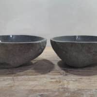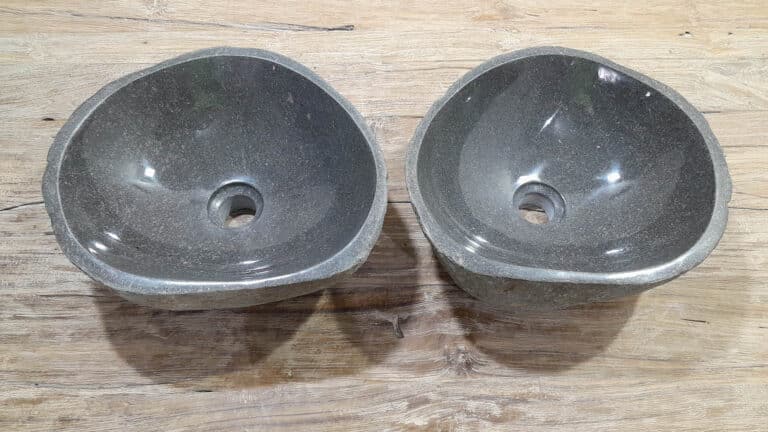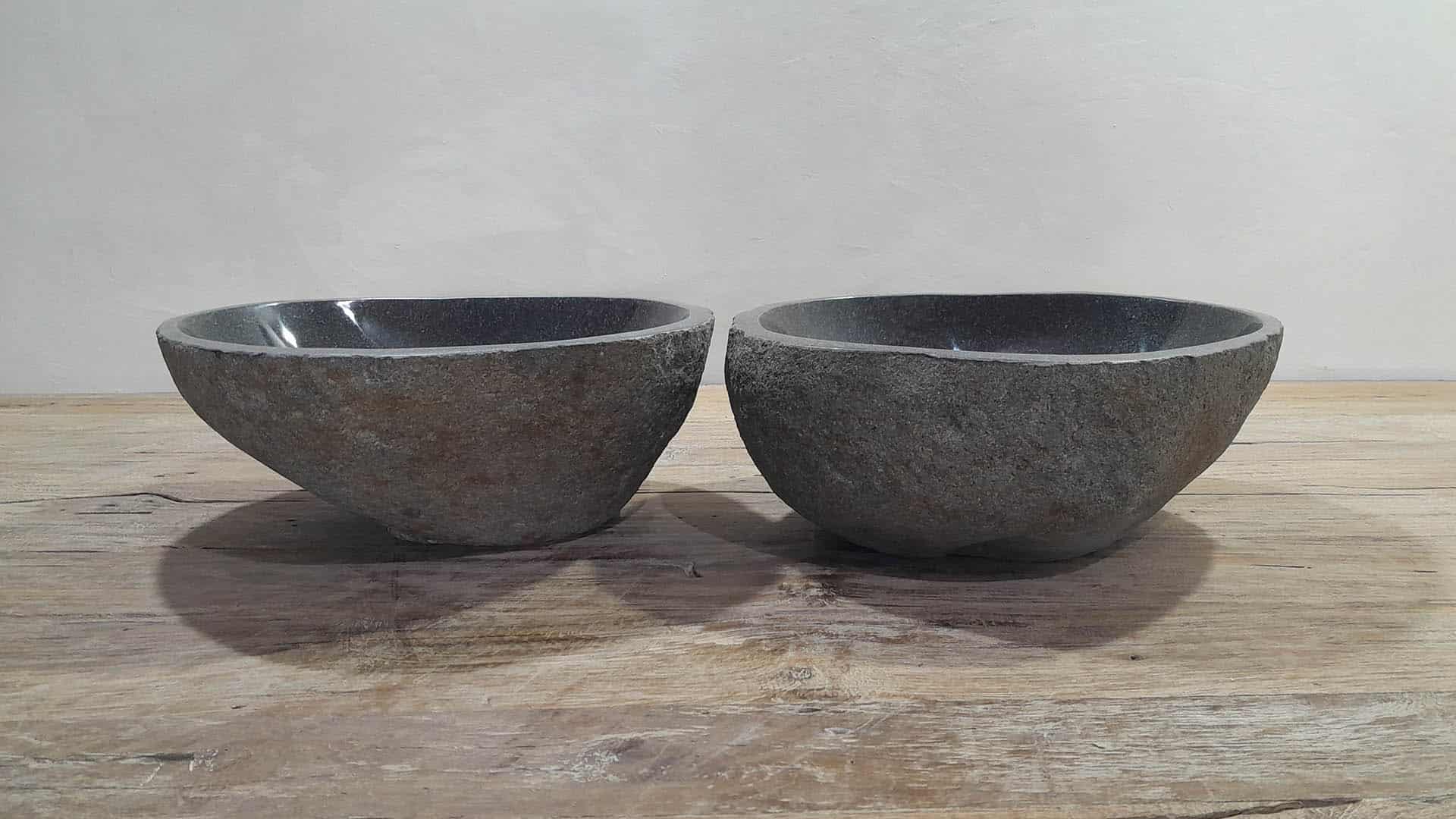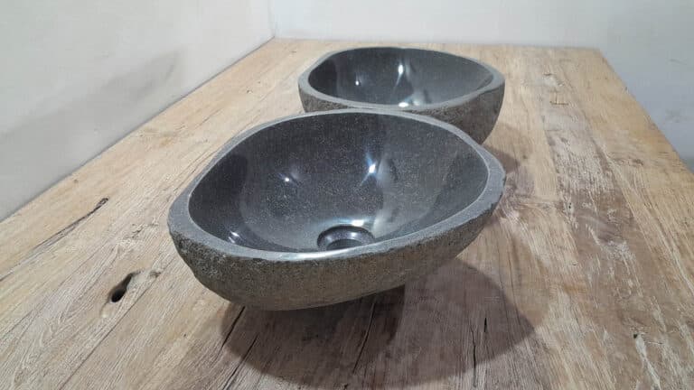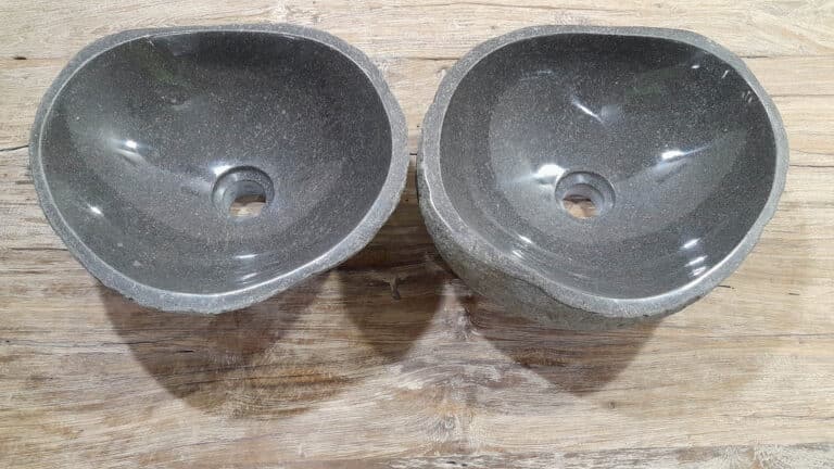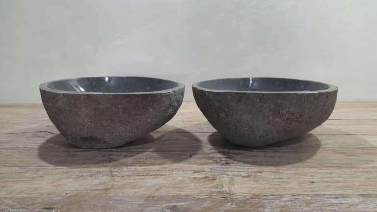 Mit diesem Flussstein Waschbecken Set holen Sie sich ein besonderes Naturprodukt in Ihr Zuhause. Das Set besteht aus zwei handgefertigten Becken, gefertigt aus einem einzigen Flussstein. So stimmen Farbe, Größe und Maserung perfekt überein, während beide Becken ihre eigene natürliche Variation behalten. Ideal für Ihren Doppelwaschtisch. Jedes Set wird vollständig von Hand aus massivem Naturstein hergestellt. Die Innenseite ist glatt poliert für optimale Wasserableitung und einfache Reinigung, während die Außenseite roh bleibt und den robusten, natürlichen Charakter bewahrt.