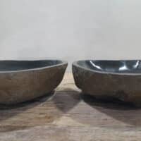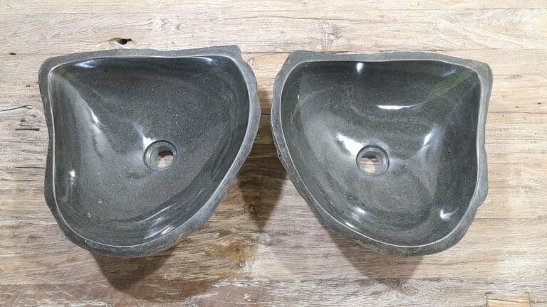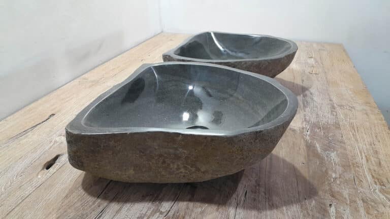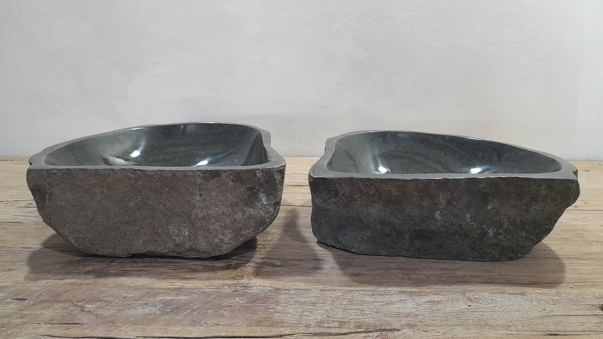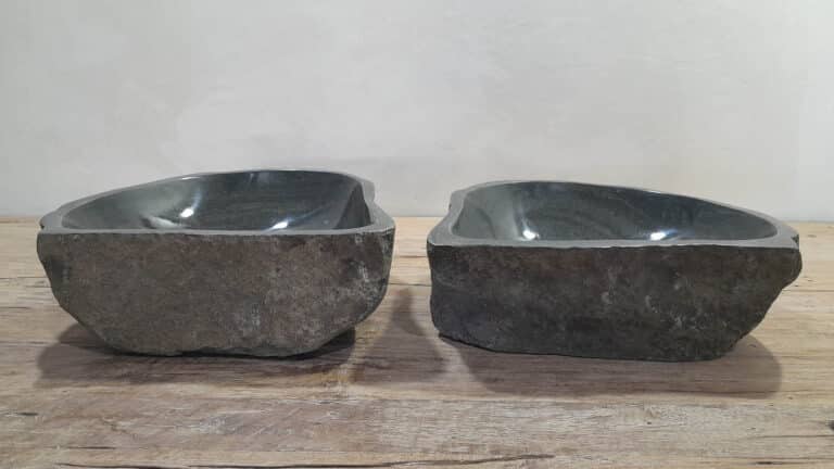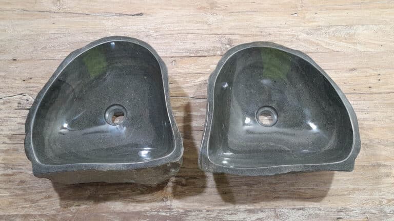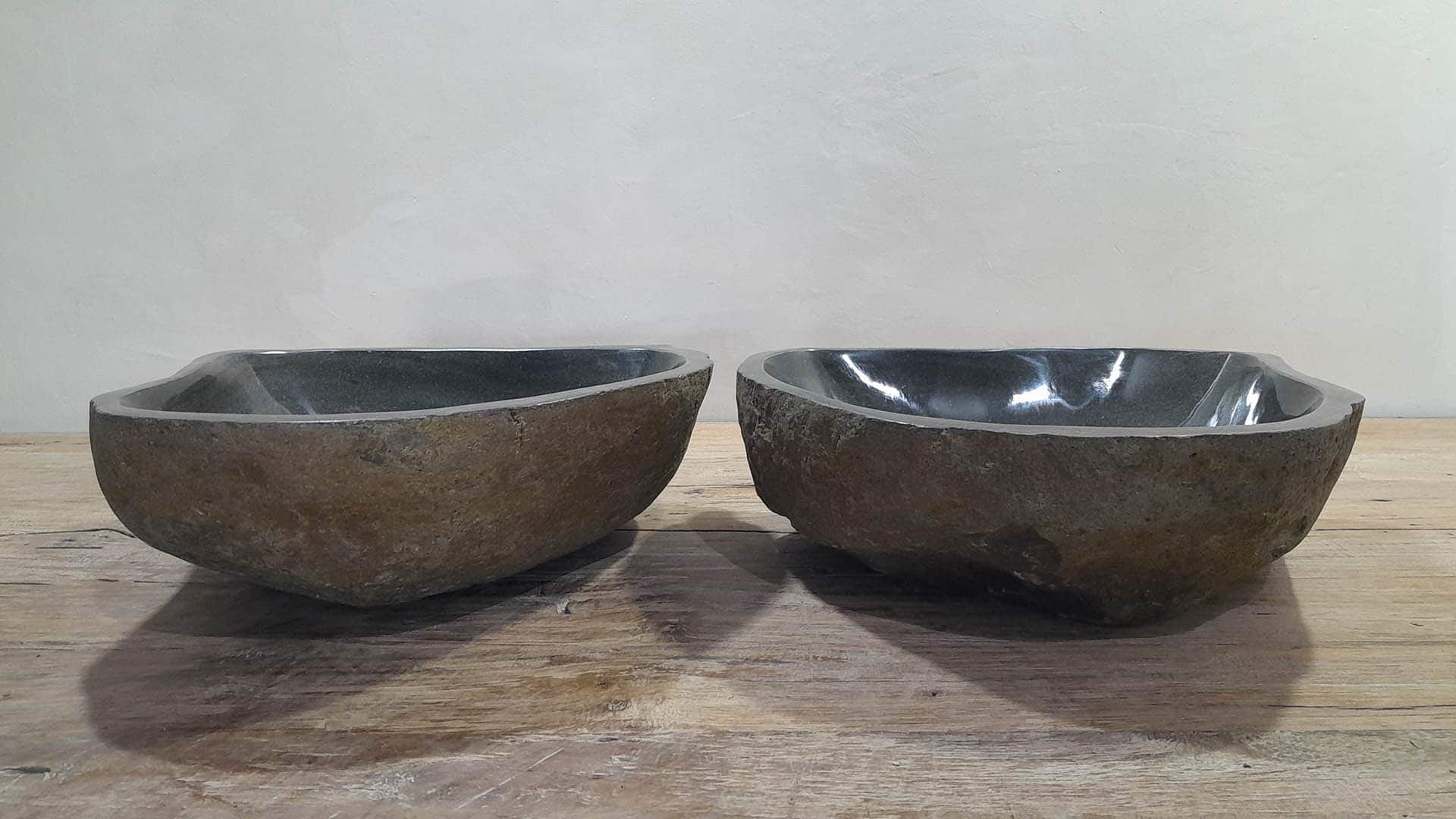 Mit diesem Flussstein Waschbecken Set holen Sie sich ein besonderes Naturprodukt in Ihr Zuhause. Das Set besteht aus zwei handgefertigten Becken, gefertigt aus einem einzigen Flussstein. So stimmen Farbe, Größe und Maserung perfekt überein, während beide Becken ihre eigene natürliche Variation behalten. Ideal für Ihren Doppelwaschtisch. Jedes Set wird vollständig von Hand aus massivem Naturstein hergestellt. Die Innenseite ist glatt poliert für optimale Wasserableitung und einfache Reinigung, während die Außenseite roh bleibt und den robusten, natürlichen Charakter bewahrt.