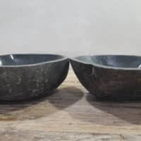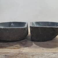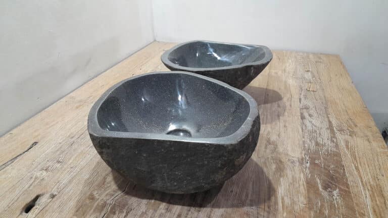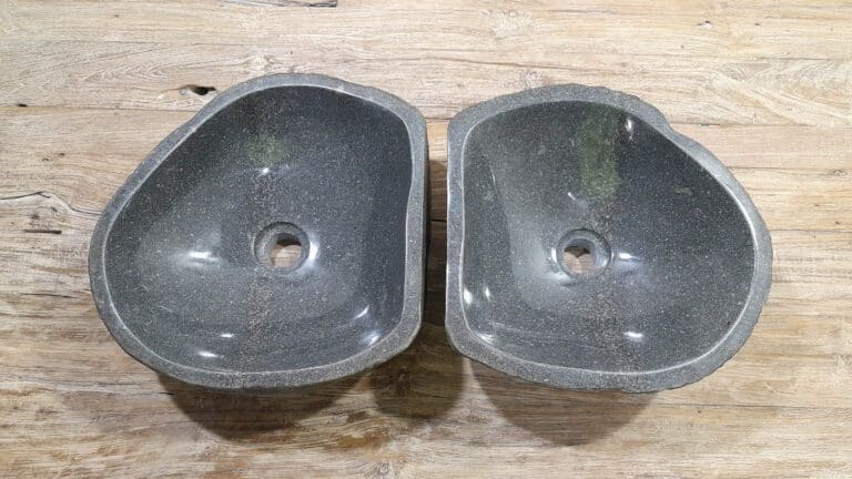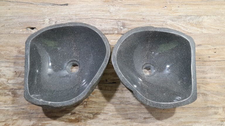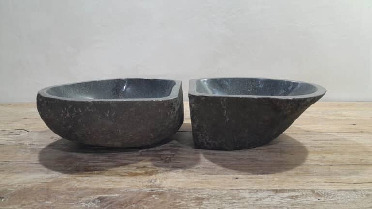 Mit diesem Flussstein Waschbecken Set holen Sie sich ein besonderes Naturprodukt in Ihr Zuhause. Das Set besteht aus zwei handgefertigten Becken, gefertigt aus einem einzigen Flussstein. So stimmen Farbe, Größe und Maserung perfekt überein, während beide Becken ihre eigene natürliche Variation behalten. Ideal für Ihren Doppelwaschtisch. Jedes Set wird vollständig von Hand aus massivem Naturstein hergestellt. Die Innenseite ist glatt poliert für optimale Wasserableitung und einfache Reinigung, während die Außenseite roh bleibt und den robusten, natürlichen Charakter bewahrt.