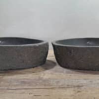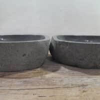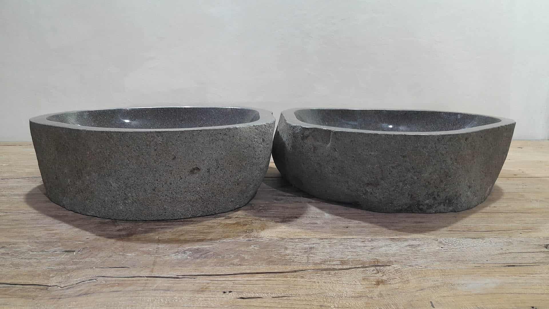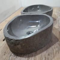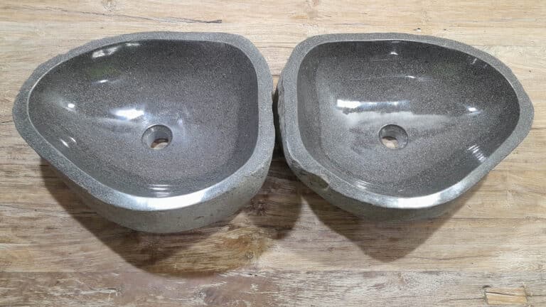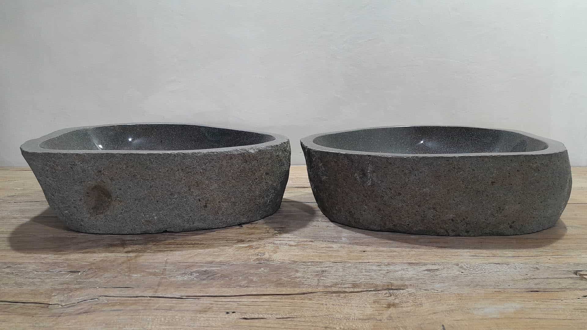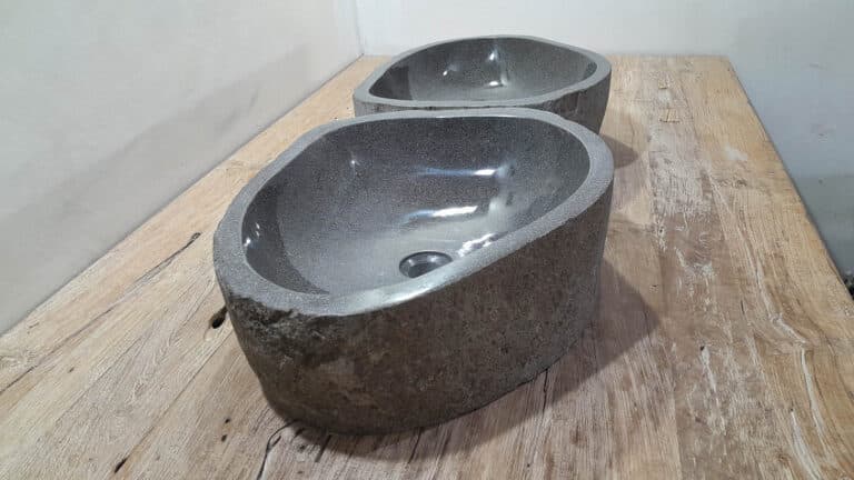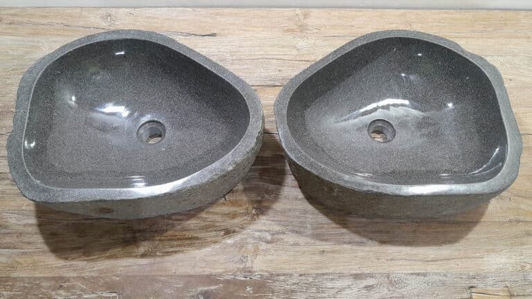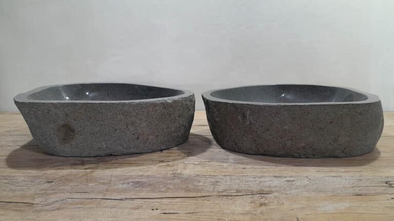 Mit diesem Flussstein Waschbecken Set holen Sie sich ein besonderes Naturprodukt in Ihr Zuhause. Das Set besteht aus zwei handgefertigten Becken, gefertigt aus einem einzigen Flussstein. So stimmen Farbe, Größe und Maserung perfekt überein, während beide Becken ihre eigene natürliche Variation behalten. Ideal für Ihren Doppelwaschtisch. Jedes Set wird vollständig von Hand aus massivem Naturstein hergestellt. Die Innenseite ist glatt poliert für optimale Wasserableitung und einfache Reinigung, während die Außenseite roh bleibt und den robusten, natürlichen Charakter bewahrt.