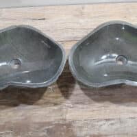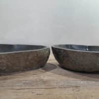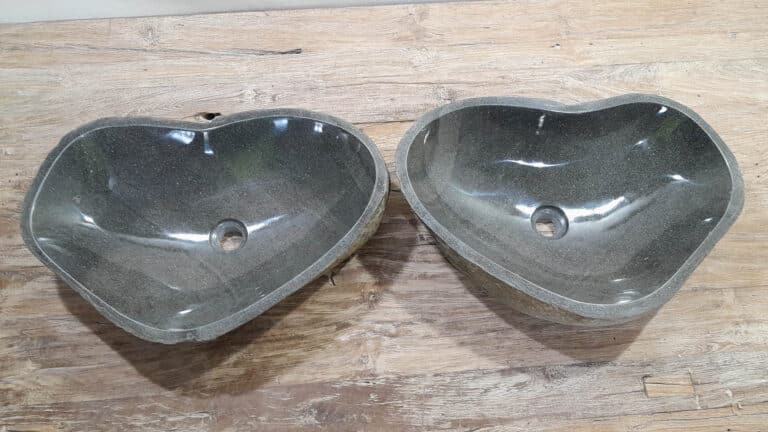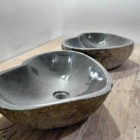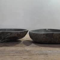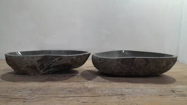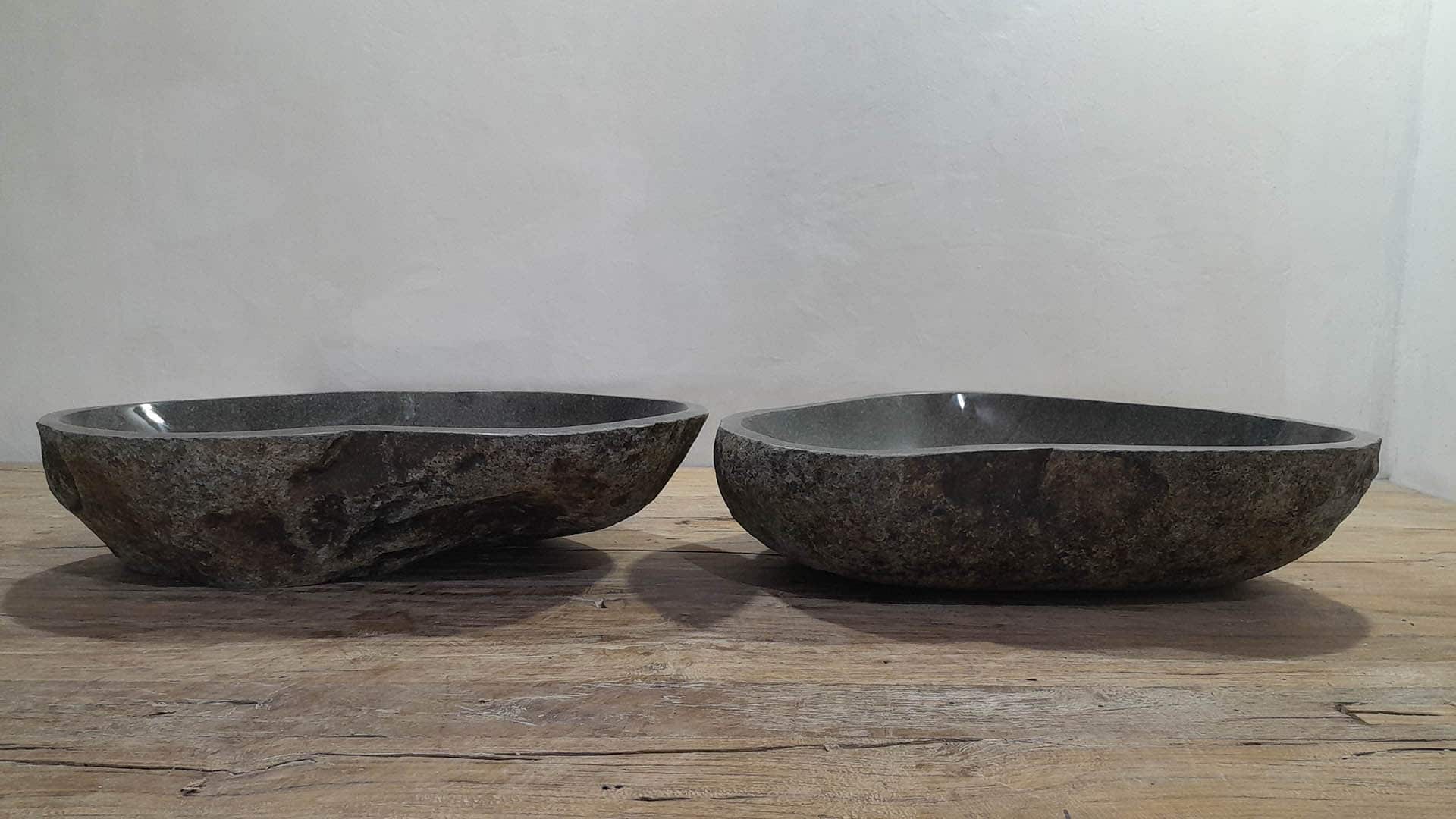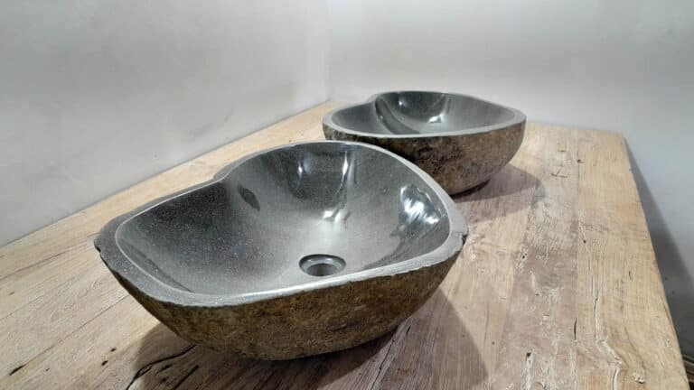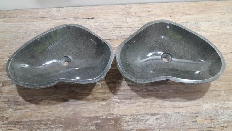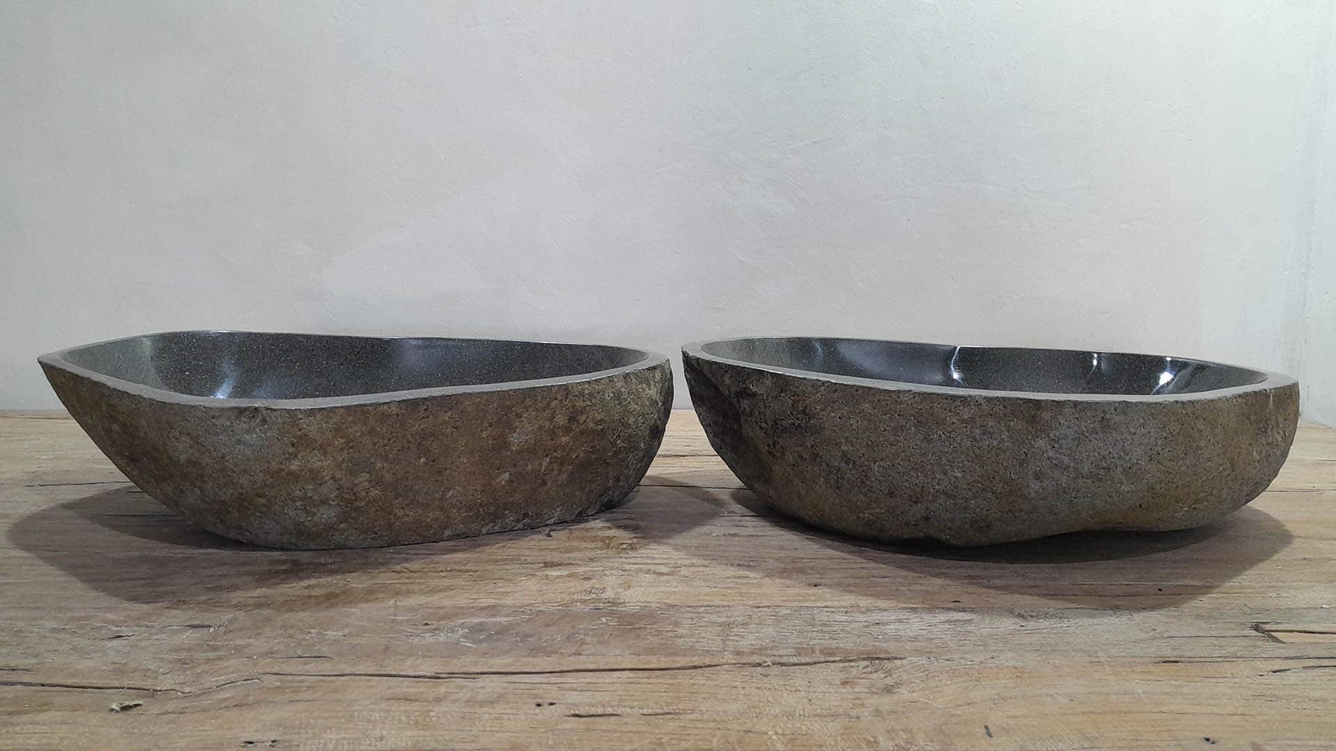 Mit diesem Flussstein Waschbecken Set holen Sie sich ein besonderes Naturprodukt in Ihr Zuhause. Das Set besteht aus zwei handgefertigten Becken, gefertigt aus einem einzigen Flussstein. So stimmen Farbe, Größe und Maserung perfekt überein, während beide Becken ihre eigene natürliche Variation behalten. Ideal für Ihren Doppelwaschtisch. Jedes Set wird vollständig von Hand aus massivem Naturstein hergestellt. Die Innenseite ist glatt poliert für optimale Wasserableitung und einfache Reinigung, während die Außenseite roh bleibt und den robusten, natürlichen Charakter bewahrt.