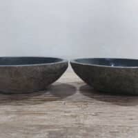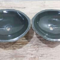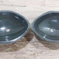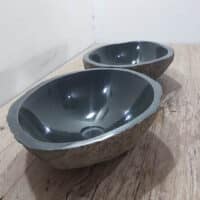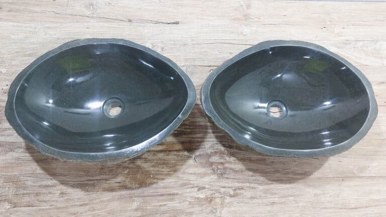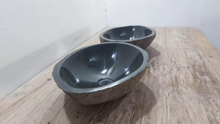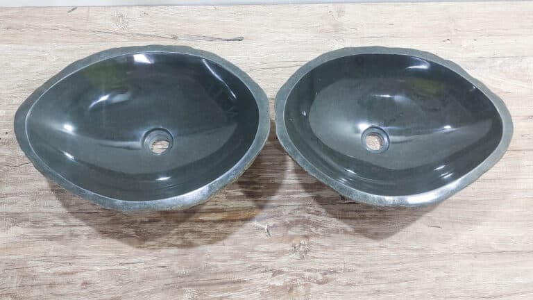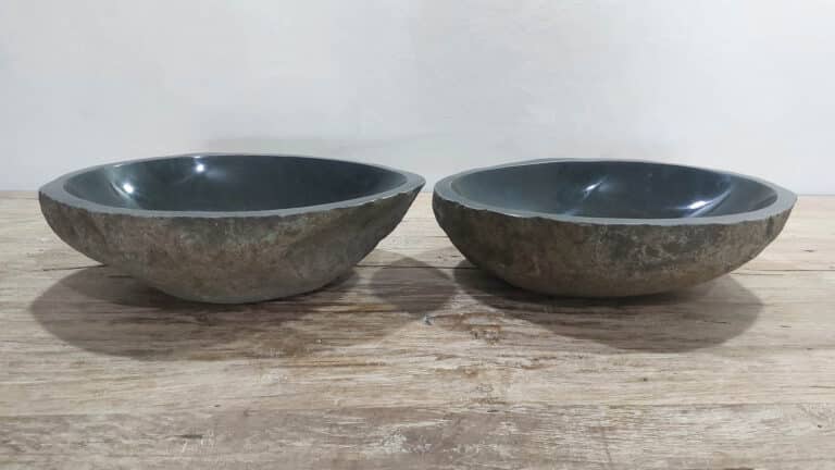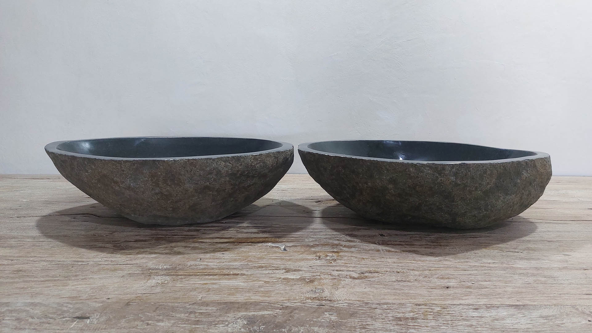 Mit diesem Flussstein Waschbecken Set holen Sie sich ein besonderes Naturprodukt in Ihr Zuhause. Das Set besteht aus zwei handgefertigten Becken, gefertigt aus einem einzigen Flussstein. So stimmen Farbe, Größe und Maserung perfekt überein, während beide Becken ihre eigene natürliche Variation behalten. Ideal für Ihren Doppelwaschtisch. Jedes Set wird vollständig von Hand aus massivem Naturstein hergestellt. Die Innenseite ist glatt poliert für optimale Wasserableitung und einfache Reinigung, während die Außenseite roh bleibt und den robusten, natürlichen Charakter bewahrt.