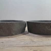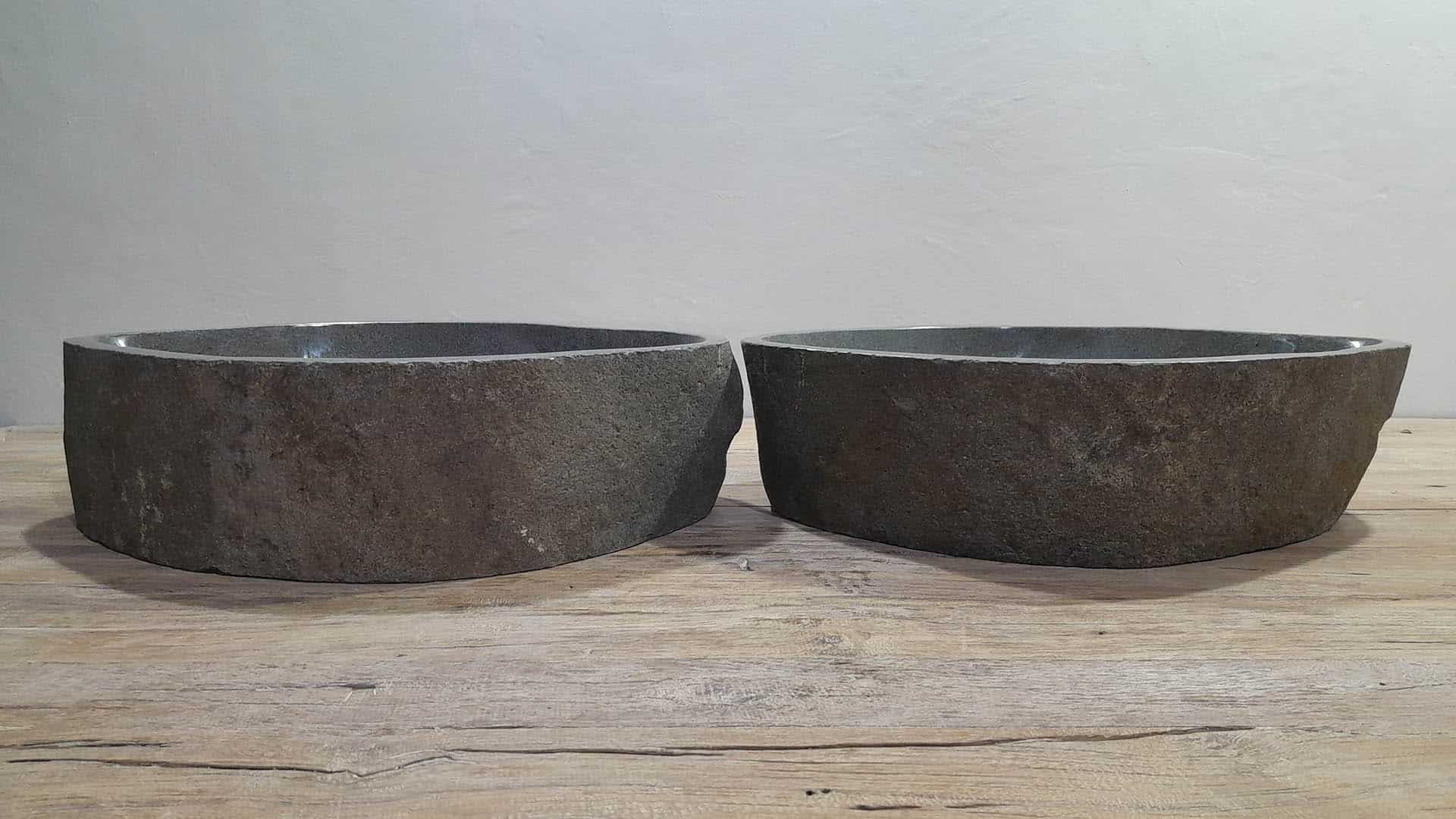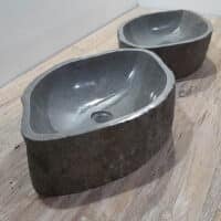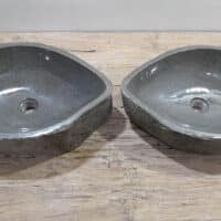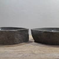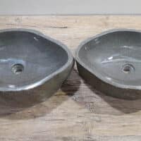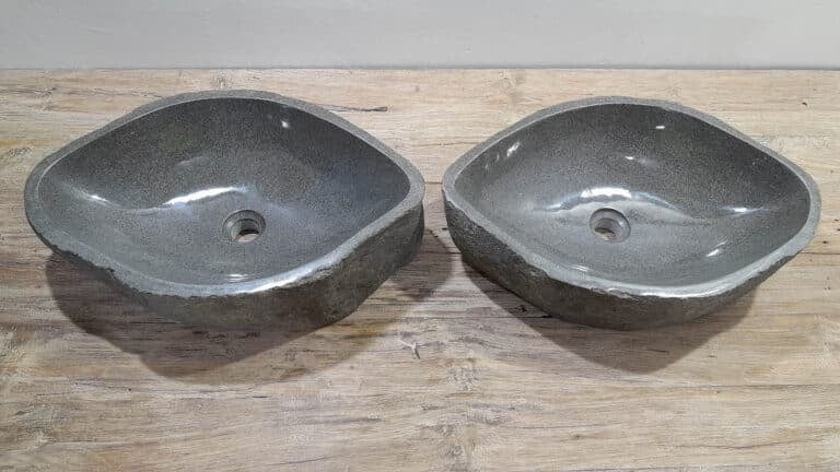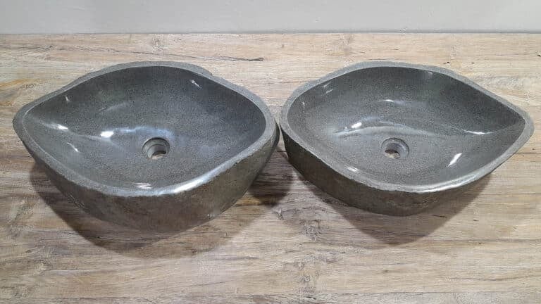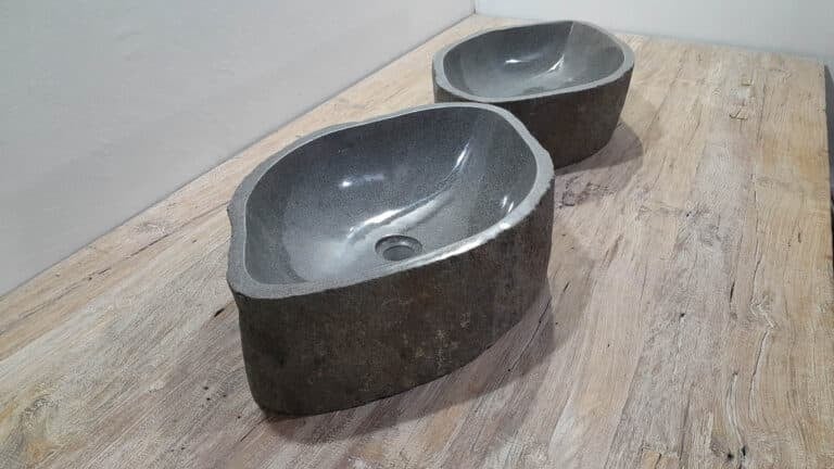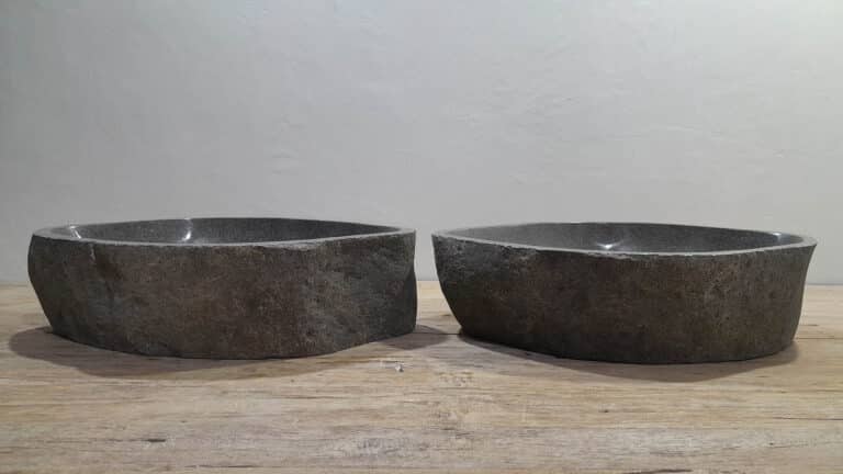 Mit diesem Flussstein Waschbecken Set holen Sie sich ein besonderes Naturprodukt in Ihr Zuhause. Das Set besteht aus zwei handgefertigten Becken, gefertigt aus einem einzigen Flussstein. So stimmen Farbe, Größe und Maserung perfekt überein, während beide Becken ihre eigene natürliche Variation behalten. Ideal für Ihren Doppelwaschtisch. Jedes Set wird vollständig von Hand aus massivem Naturstein hergestellt. Die Innenseite ist glatt poliert für optimale Wasserableitung und einfache Reinigung, während die Außenseite roh bleibt und den robusten, natürlichen Charakter bewahrt.