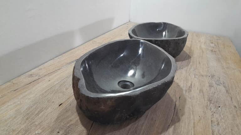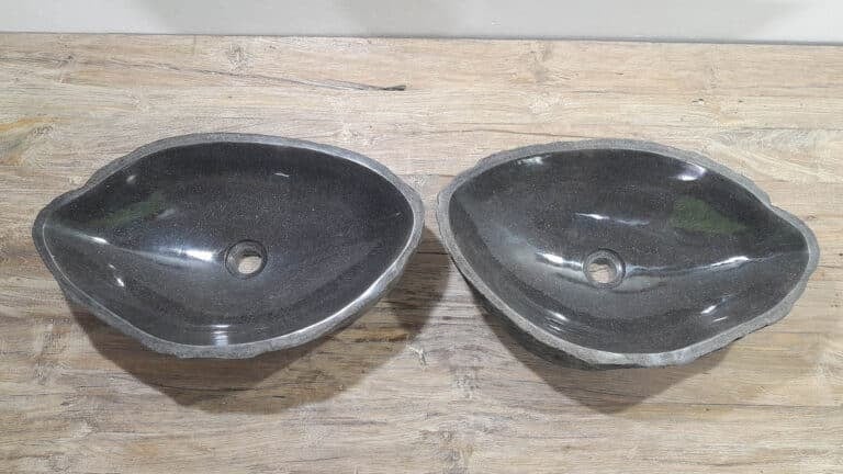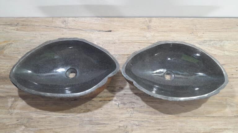 Mit diesem Flussstein Waschbecken Set holen Sie sich ein besonderes Naturprodukt in Ihr Zuhause. Das Set besteht aus zwei handgefertigten Becken, gefertigt aus einem einzigen Flussstein. So stimmen Farbe, Größe und Maserung perfekt überein, während beide Becken ihre eigene natürliche Variation behalten. Ideal für Ihren Doppelwaschtisch. Jedes Set wird vollständig von Hand aus massivem Naturstein hergestellt. Die Innenseite ist glatt poliert für optimale Wasserableitung und einfache Reinigung, während die Außenseite roh bleibt und den robusten, natürlichen Charakter bewahrt.