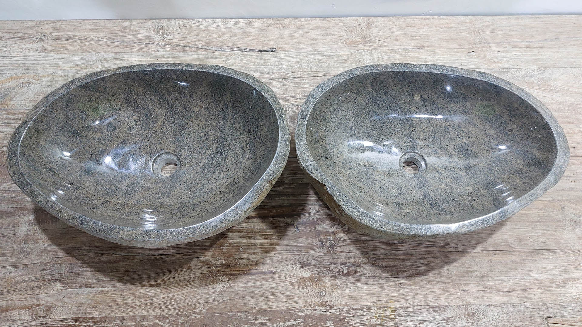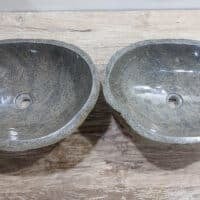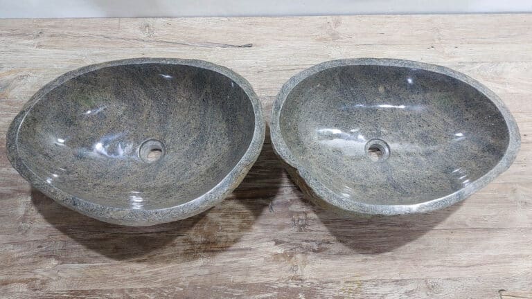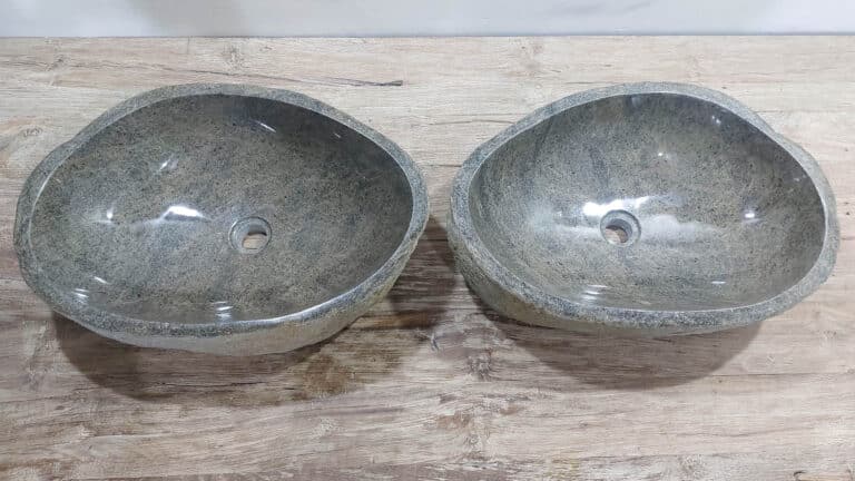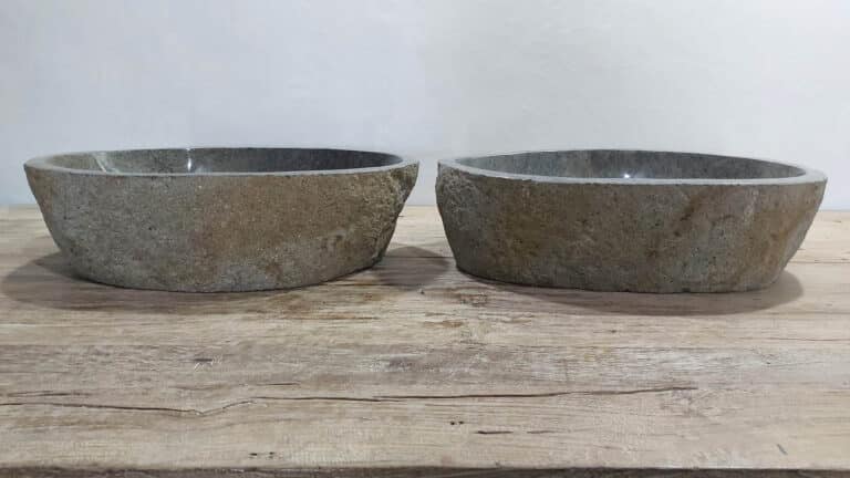 Mit diesem Flussstein Waschbecken Set holen Sie sich ein besonderes Naturprodukt in Ihr Zuhause. Das Set besteht aus zwei handgefertigten Becken, gefertigt aus einem einzigen Flussstein. So stimmen Farbe, Größe und Maserung perfekt überein, während beide Becken ihre eigene natürliche Variation behalten. Ideal für Ihren Doppelwaschtisch. Jedes Set wird vollständig von Hand aus massivem Naturstein hergestellt. Die Innenseite ist glatt poliert für optimale Wasserableitung und einfache Reinigung, während die Außenseite roh bleibt und den robusten, natürlichen Charakter bewahrt.