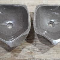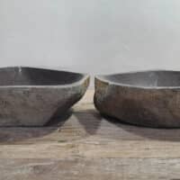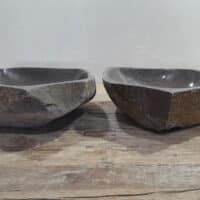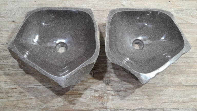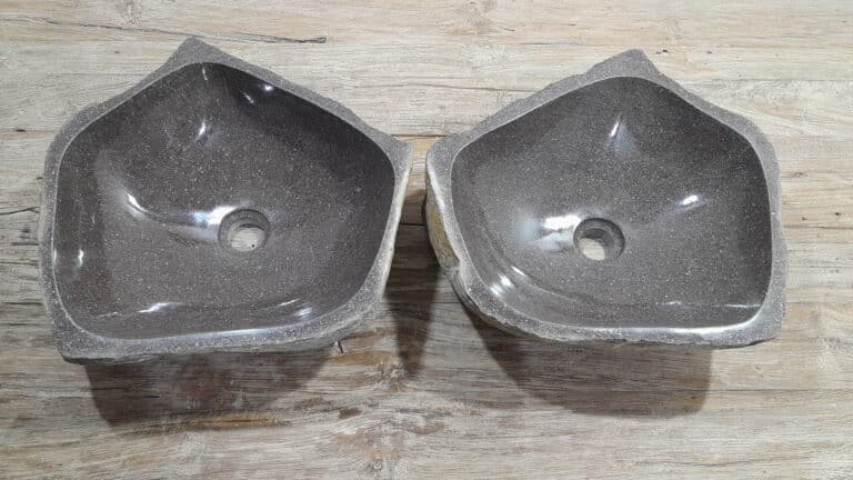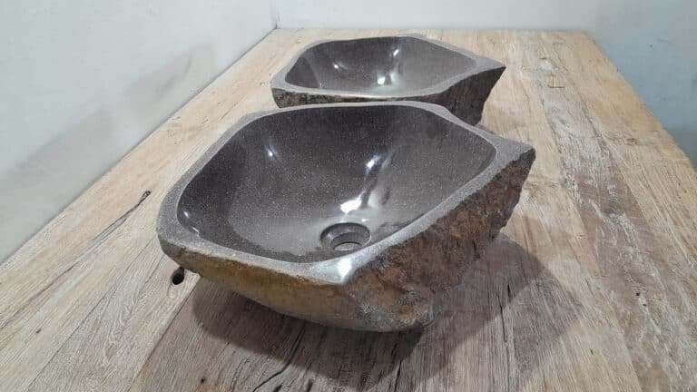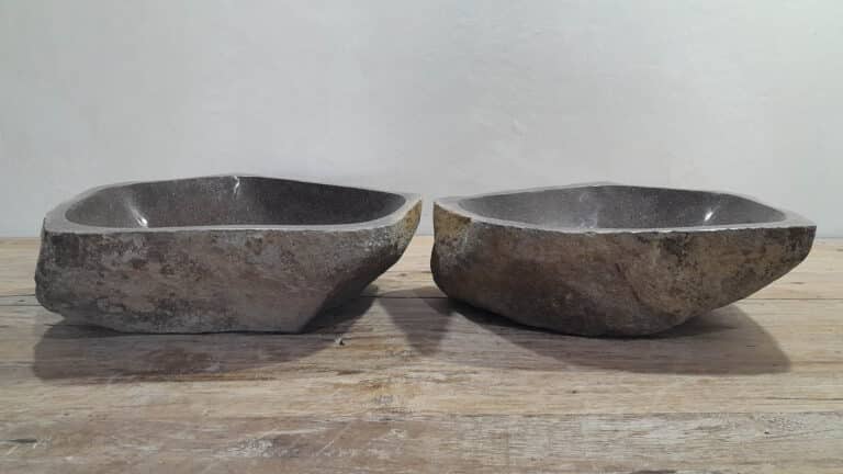 Mit diesem Flussstein Waschbecken Set holen Sie sich ein besonderes Naturprodukt in Ihr Zuhause. Das Set besteht aus zwei handgefertigten Becken, gefertigt aus einem einzigen Flussstein. So stimmen Farbe, Größe und Maserung perfekt überein, während beide Becken ihre eigene natürliche Variation behalten. Ideal für Ihren Doppelwaschtisch. Jedes Set wird vollständig von Hand aus massivem Naturstein hergestellt. Die Innenseite ist glatt poliert für optimale Wasserableitung und einfache Reinigung, während die Außenseite roh bleibt und den robusten, natürlichen Charakter bewahrt.