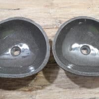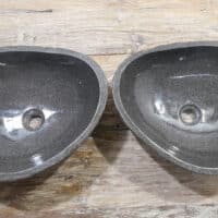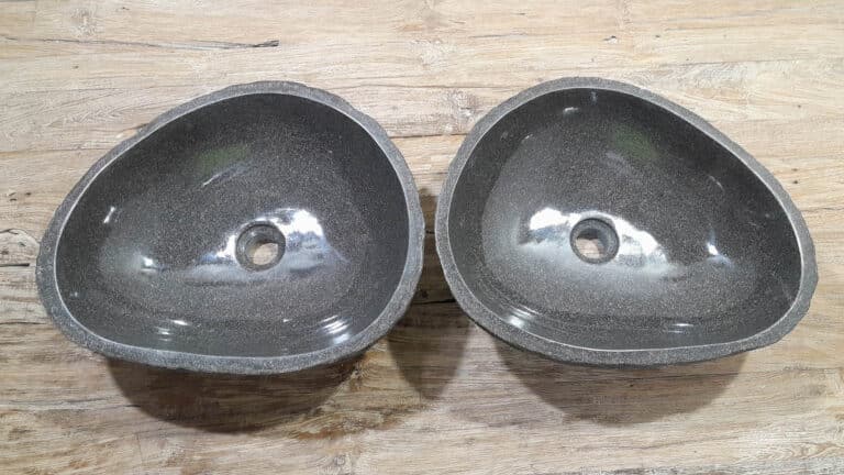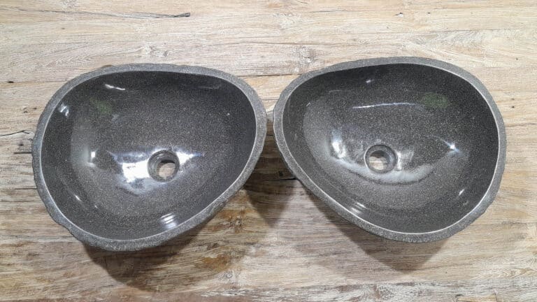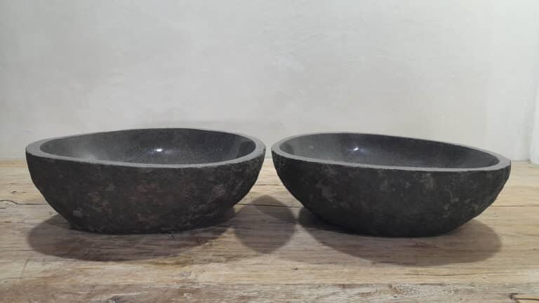 Mit diesem Flussstein Waschbecken Set holen Sie sich ein besonderes Naturprodukt in Ihr Zuhause. Das Set besteht aus zwei handgefertigten Becken, gefertigt aus einem einzigen Flussstein. So stimmen Farbe, Größe und Maserung perfekt überein, während beide Becken ihre eigene natürliche Variation behalten. Ideal für Ihren Doppelwaschtisch. Jedes Set wird vollständig von Hand aus massivem Naturstein hergestellt. Die Innenseite ist glatt poliert für optimale Wasserableitung und einfache Reinigung, während die Außenseite roh bleibt und den robusten, natürlichen Charakter bewahrt.