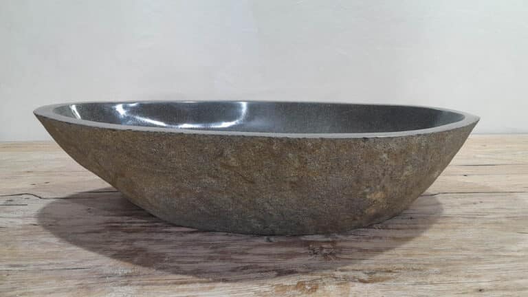 Diese große Naturstein Waschschale aus Flussstein ist ideal für geräumige Badmöbel, sowohl für große Einzel- als auch Doppelwaschtische. Die Innenseite der Flussstein Schale wird glatt poliert für eine schnelle Wasserableitung und einfache Reinigung, während die Außenseite roh und unbehandelt bleibt, wodurch die Schale ihren robusten und natürlichen Charakter behält.