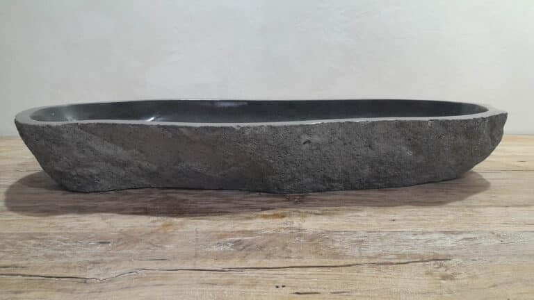 Diese große Naturstein Waschschale aus Flussstein ist ideal für geräumige Badmöbel, sowohl für große Einzel- als auch Doppelwaschtische. Die Innenseite der Flussstein Schale wird glatt poliert für eine schnelle Wasserableitung und einfache Reinigung, während die Außenseite roh und unbehandelt bleibt, wodurch die Schale ihren robusten und natürlichen Charakter behält.