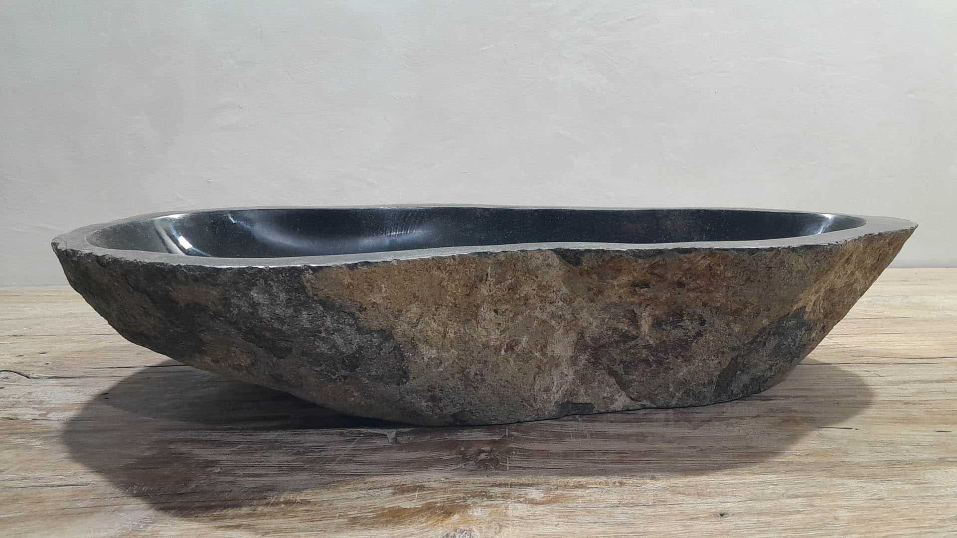 Diese große Naturstein Waschschale aus Flussstein ist ideal für geräumige Badmöbel, sowohl für große Einzel- als auch Doppelwaschtische. Die Innenseite der Flussstein Schale wird glatt poliert für eine schnelle Wasserableitung und einfache Reinigung, während die Außenseite roh und unbehandelt bleibt, wodurch die Schale ihren robusten und natürlichen Charakter behält.
