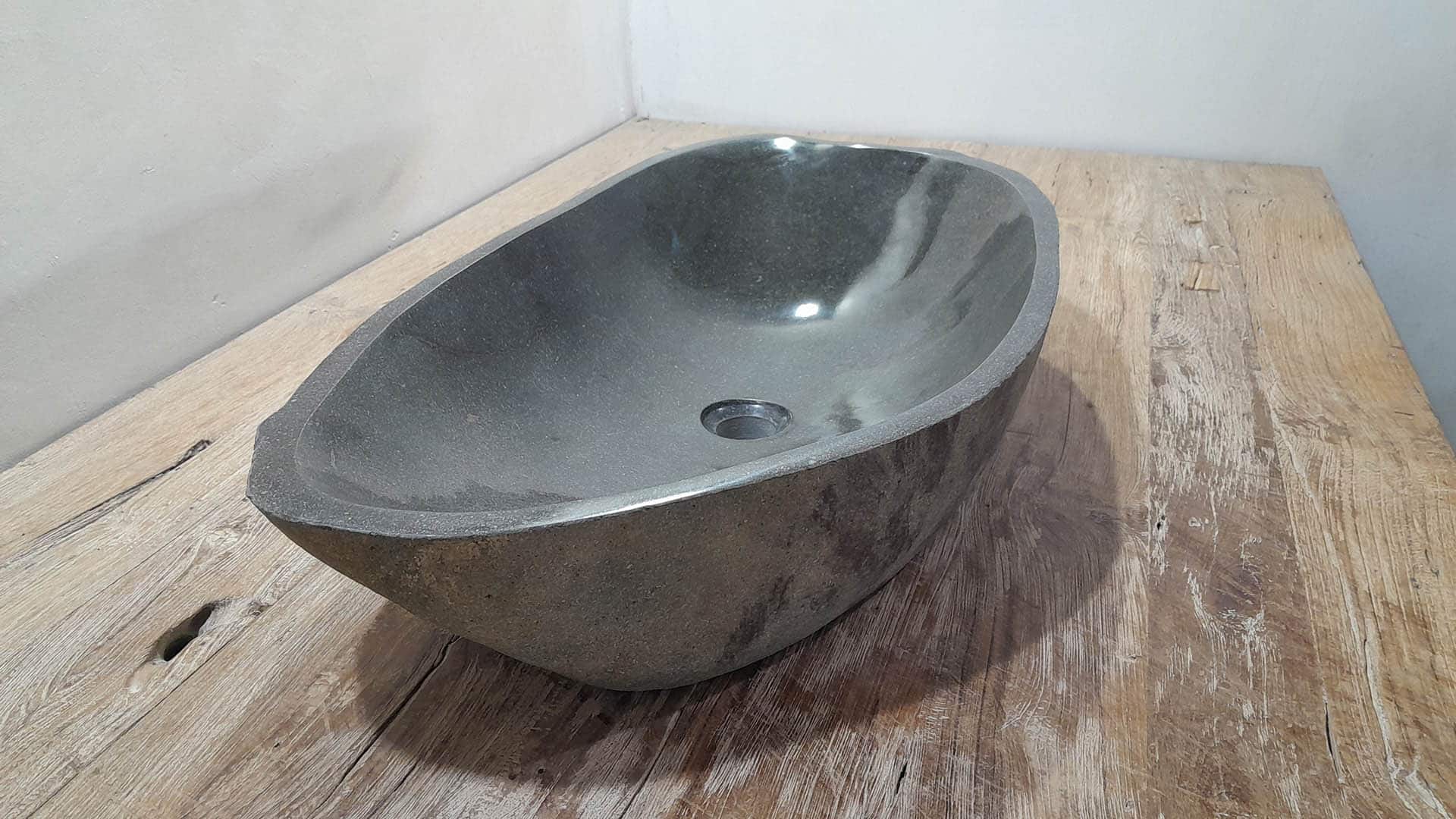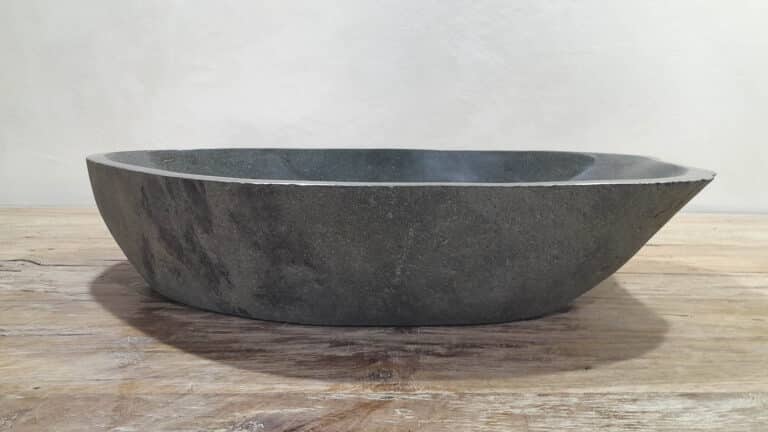 Diese große Naturstein Waschschale aus Flussstein ist ideal für geräumige Badmöbel, sowohl für große Einzel- als auch Doppelwaschtische. Die Innenseite der Flussstein Schale wird glatt poliert für eine schnelle Wasserableitung und einfache Reinigung, während die Außenseite roh und unbehandelt bleibt, wodurch die Schale ihren robusten und natürlichen Charakter behält.